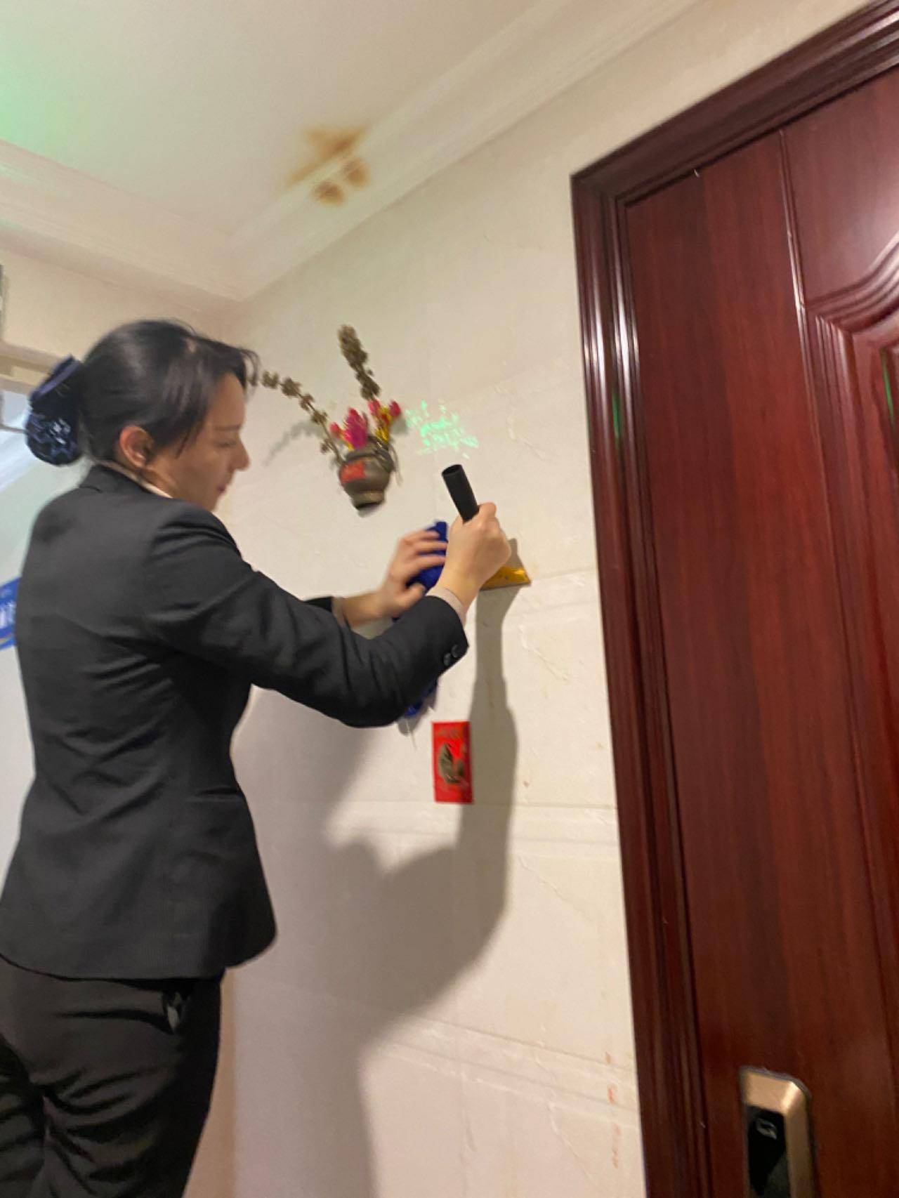 汕头柏丽湾小区的章伯独自居住,老人颈椎腰椎不太好,常年弯着腰无法完全直立。有一年除夕下午,章伯焦急联系上了周管家,原本准备家人一起贴对联,但几个子女都没回来。一听这个情况,周管家马上约上环境领班一起过去,把章伯家楼道清洁干净并贴好对联。