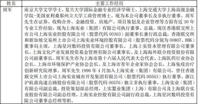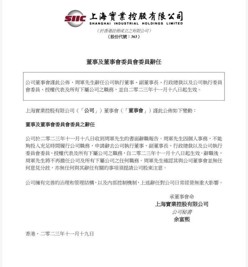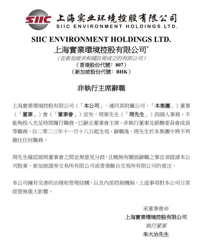 上海证券报记者注意到,港股上海实业环境同日公告,周军因个人原因,不能够投入充足时间履行公司职务,已辞去董事会主席、非执行董事等职务。