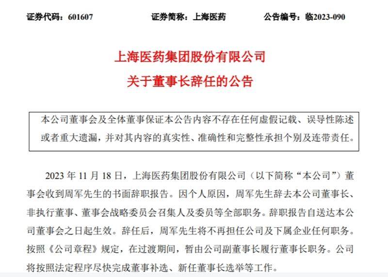 11月20日早间,上海医药发布公告称,因个人原因,公司董事长周军辞职。