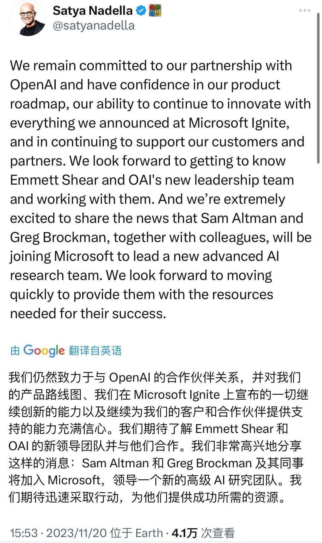Satya Nadella在其社交媒体上表示:我们仍然致力于与 OpenAI 的合作伙伴关系,并对我们的产品路线图、我们在 Microsoft Ignite 上宣布的一切继续创新的能力,以及继续为我们的客户和合作伙伴提供支持的能力充满信心。我们期待了解 Emmett Shear (OpenAI新任CEO)和 OpenAI 的新领导团队并与他们合作。我们非常高兴地分享这样的消息:Sam Altman 和 Greg Brockman 及其同事将加入微软,领导一个新的高级 AI 研究团队。我们期待迅速采取行动,为他们提供成功所需的资源。