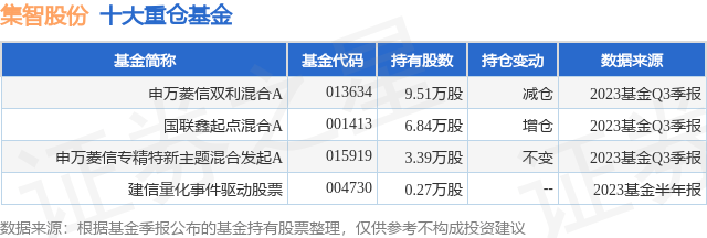 根据2023基金Q3季报公募基金重仓股数据,重仓该股的公募基金共3家,其中持有数量最多的公募基金为申万菱信双利混合A。申万菱信双利混合A目前规模为4.46亿元,最新净值0.9121(11月17日),较上一交易日上涨0.26%,近一年下跌6.02%。该公募基金现任基金经理为唐俊杰 季鹏。唐俊杰在任的基金产品包括:申万菱信安泰惠利纯债A,管理时间为2019年1月25日至今,期间收益率为17.17%;申万菱信安泰广利63个月定开债,管理时间为2020年11月3日至今,期间收益率为11.75%;申万菱信稳鑫30天滚动持有短债债券A,管理时间为2022年4月21日至今,期间收益率为1.83%。季鹏在任的基金产品包括:申万菱信盛利精选混合,管理时间为2023年9月18日至今,期间收益率为-1.9%;申万菱信竞争优势混合A,管理时间为2023年9月18日至今,期间收益率为-3.69%。