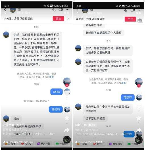 11月16日,有网友在微博发帖表示,收到网上陌生人的私信,如能提供小米手机卡顿、发热、掉帧等的视频素材,可获得转账报酬,视频素材将会发布在抖音、B站等社交媒体平台上。
