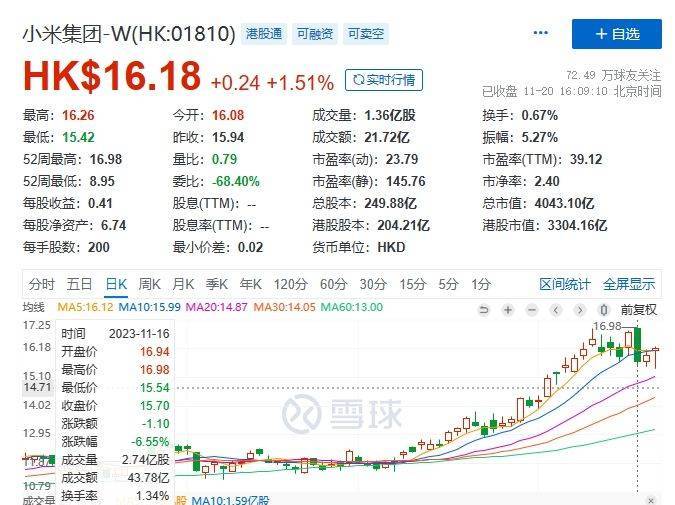 股价方面,小米(01810)16日开盘即暴跌,收盘跌6.55%,随后两日有所回升。11月20日收盘涨1.51%,报16.18港元。