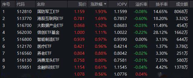 盘面上,国防军工、大数据、信创、医疗、金融科技等题材股多点开花。其中,国防军工ETF(512810)全天单边上扬,场内价格收涨近2%!大数据产业ETF(516700)、信创ETF基金(562030)场内价格纷纷收涨超1%!港股也同步延续上涨,港股互联网ETF(513770)场内价格收涨1.69%!