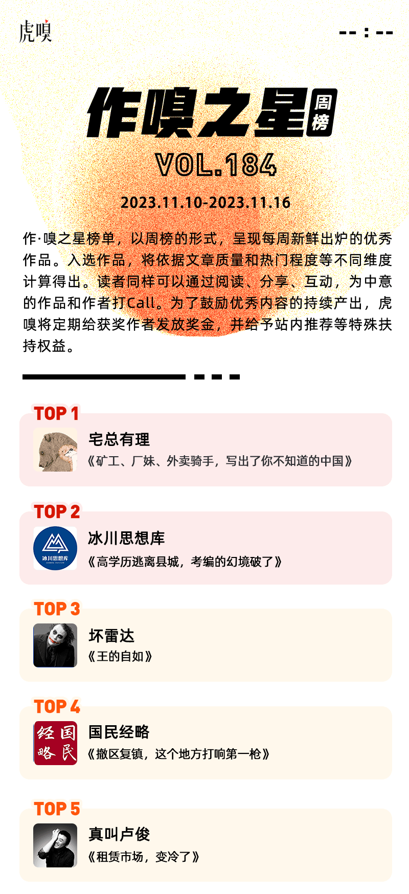 作·嗅之星榜单,以周榜的形式,呈现每周新鲜出炉的优秀作品。2023年11月10日~2023年11月16日,虎嗅第184期作·嗅之星的获奖文章分别是: