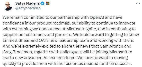 据路透社20日报道,微软CEO纳德拉在社交媒体上发文称,微软仍然致力于与OpenAI的合作,并期待了解希尔领导的新团队。同时纳德拉宣布,阿尔特曼、OpenAI前总裁格雷格•布罗克曼及其同事将加入微软,领导一个新的高级人工智能研究团队。微软期待着迅速采取行动,为其成功提供所需的资源。
