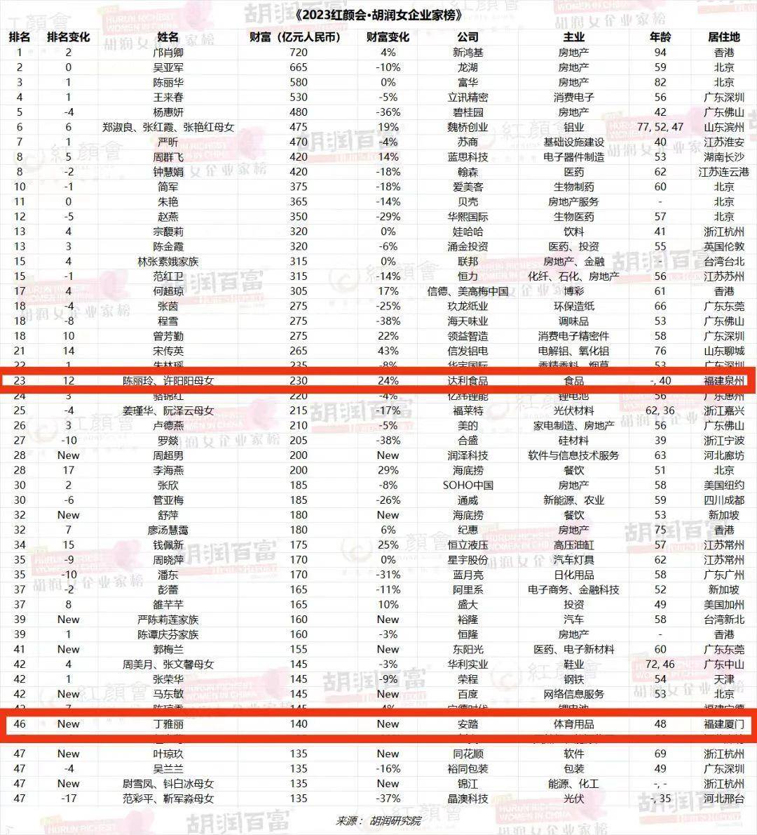 近日,胡润研究院发布《2023胡润女企业家榜》,列出了今年胡润百富榜上前50名女企业家。其中,达利食品的陈丽玲、许阳阳母女以230亿元的财富位居第23位。