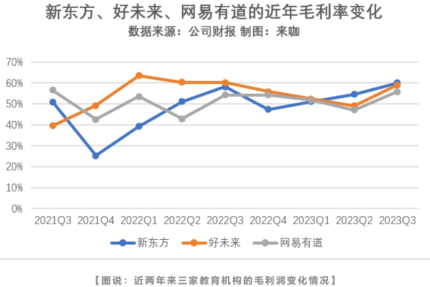 根据统计数据,新东方、好未来、有道三家教育机构,在经历了营收的低谷后,伴随着营收的企稳回升,毛利率也整体呈现出逐季增长的趋势,目前三家的毛利率都已经接近60%,甚至有的已经超过了双减前的水平。