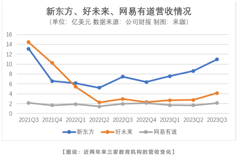 最近,新东方、好未来、网易有道三家教育企业都先后发布了新一季的财报。作为行业率先转型的代表,三家的新财季整体上都创造了“双减”之后较好业绩,反映出转型效果显著。比如新东方基本回到“双减”前的营收水平,经营利润绝对值达到了历史高位,好未来实现了扭亏为盈,而有道单季营收创下了历史新高,经营亏损大幅度收窄。