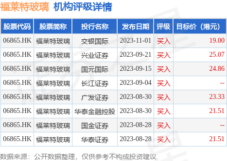 截至2023年11月20日收盘,福莱特玻璃(06865.HK)报收于14.52港元,下跌0.82%,换手率0.79%,成交量354.42万股,成交额5144.24万港元。投行对该股的评级以买入为主,近90天内共有8家投行给出买入评级,近90天的目标均价为22.55港元。交银国际最新一份研报给予福莱特玻璃买入评级,目标价19港元。