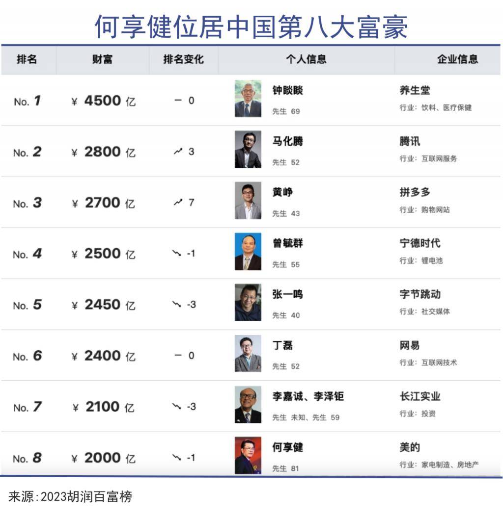 作为一家家电龙头,美的想做产业延伸,依然通过对外投资来实现。美的集团的资本版图扩张史,实际上也是一部老牌家电企业谋求多元化发展路径的 " 进化史 "。以何享健为核心的何氏家族在资本圈斩获颇丰。美的集团创始人及实控人何享健自 2012 年退居二线之后,便较少出现在公众视野,现已 80 岁高龄,坐拥千亿资产。左手实业,右手金融,不亦乐乎。在今年公布的《2023 胡润百富榜》中,何享健家族的财富达 2000 亿元,位列第 8 位。