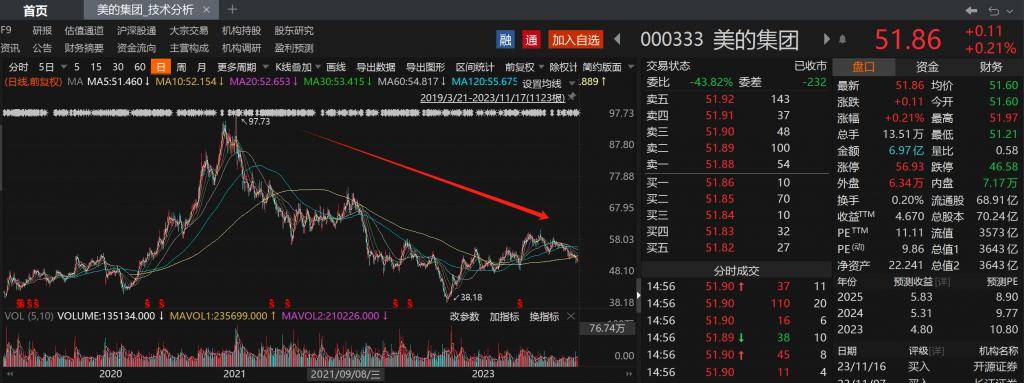 家电行业分析师梁振鹏表示,美的多元化步子迈得太大,都是非相关多元化,连一些小公司也收购。像菱王电梯这样的三线品牌,这个和美的地产业务还有一定的协同,但收购过来大量非相关业务,没有专业人士打理,还占用主业的发展资源,这样的多元化很危险。历史上像小天鹅、澳柯玛、春兰等企业,都是由于多元化扩张拖垮主业。从美的集团自身股价表现上来看,较 2021 年高点迄今,股价累计最大跌幅达 60.9%。
