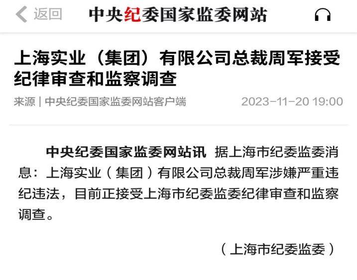 但在11月20日晚,中央纪委国家监委网站发布消息称,据上海市纪委监委消息,上海实业(集团)有限公司总裁周军涉嫌严重违纪违法,目前正接受上海市纪委监委纪律审查和监察调查。