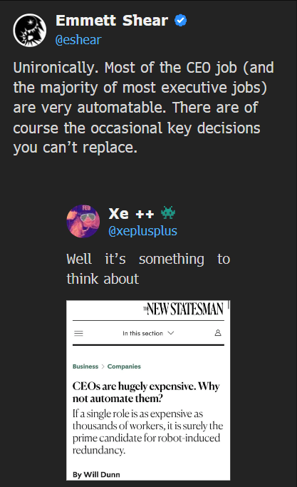 9月份时,Shear在推特上表示他赞成放慢AI技术的发展脚步。“我们无法学习如何在不进行实验的情况下构建安全的AI,没有进展我们就无法进行实验,但我们可能也不应该以最快的速度前进,”他补充道。