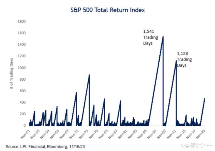 根据Daily Chartbook的研究,最长的一段时间发生在互联网泡沫之后。在此期间,标普500指数连续超过1500天没有触及新高。