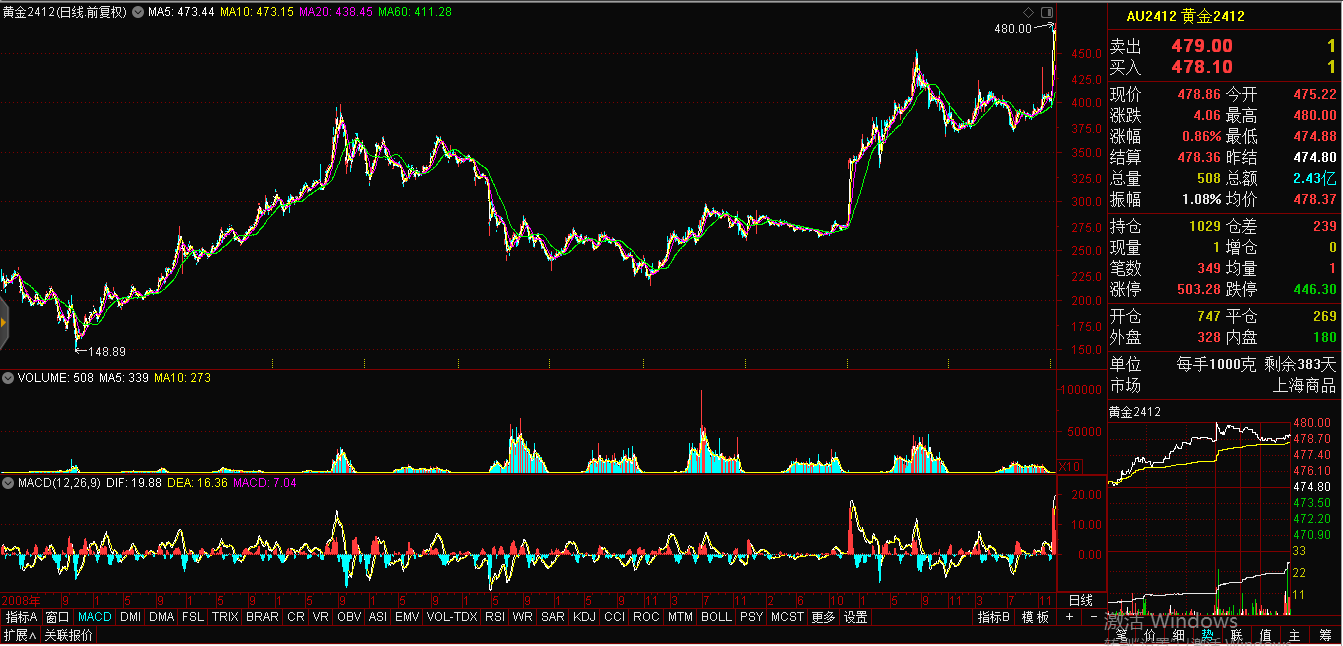 在纽约黄金强劲攀升的激励下,国内黄金期货市场也积极走高,代表所有黄金期货品种的黄金指数上涨了0.95%,黄金主连则上涨了0.96%。8个期货合约品种中,特别值得一提的是“黄金2412”——它是所有标的中唯一一个突破历史新高的品种。