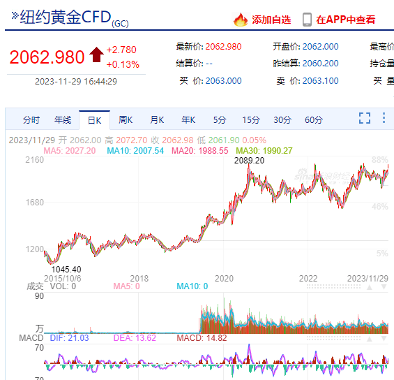 具体来看,上周企稳于2000美元/盎司的纽约黄金,在本周进入加速逼空模式。其中11月28日,纽约黄金涨至2.37%,一举创下半年来的新高。11月29日截至北京时间16点30分,纽约黄金继续震荡走高,盘中见到了2072.70美元/盎司,距离2020年8月7日创下的2089.20美元/盎司只差临门一脚。