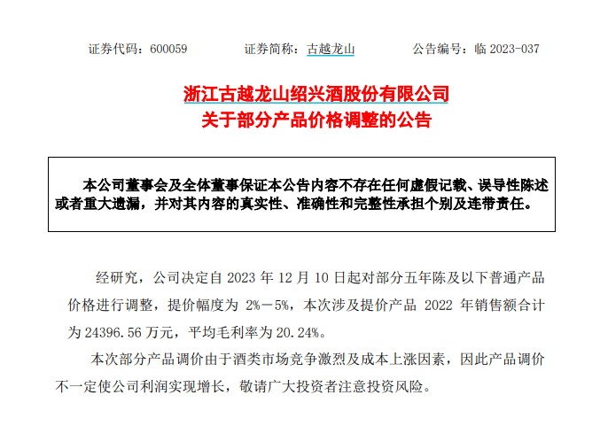 11月28日,头部黄酒企业古越龙山发布公告称,将自12月10日起对部分五年陈及以下普通产品价格进行调整,提价幅度2%-5%。