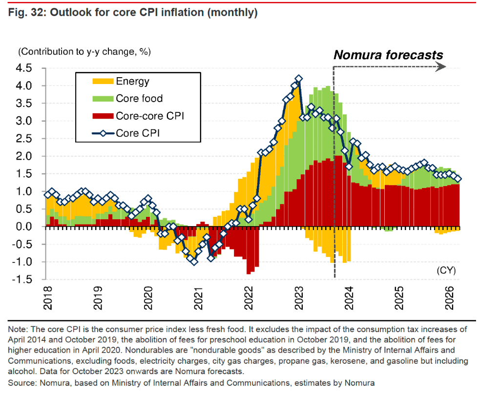 我们预计到2024年1月,能源通胀将降至负数,但随着政府控制能源成本措施的影响减弱,从2024年2月将再次上涨至正值。我们的假设是,日本政府将从2024年5月起的六个月内逐步取消能源补贴,防止对家庭预算造成直接冲击。
