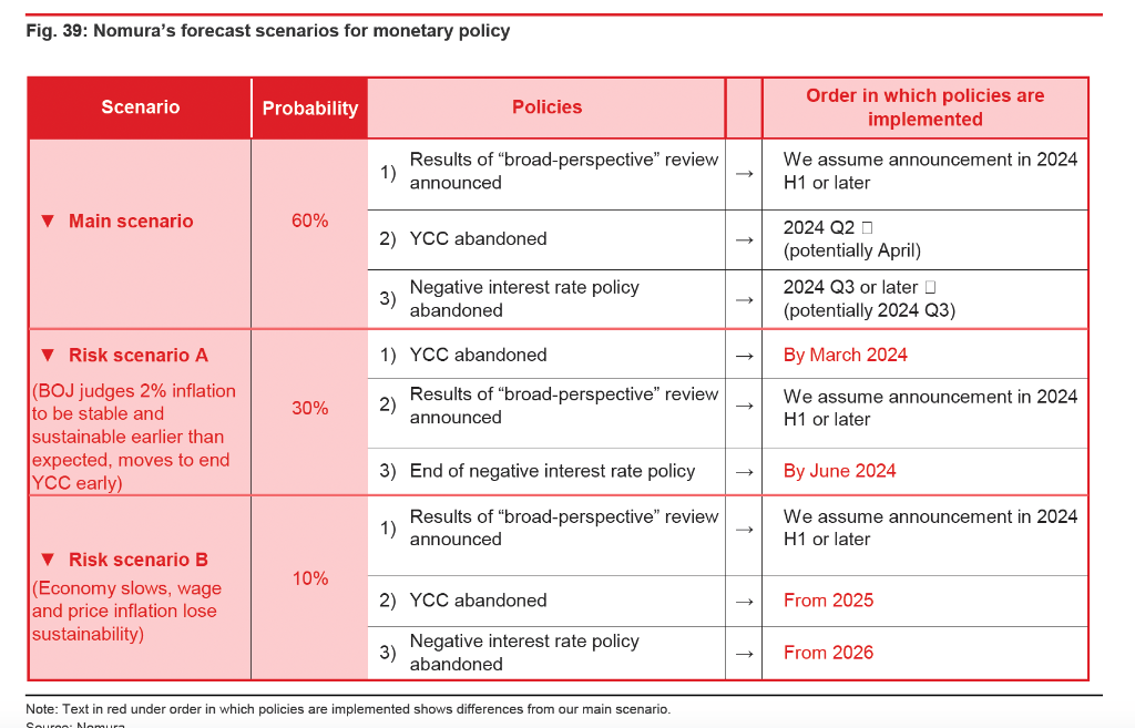 野村指出,基于日本经济将持续复苏以及通胀趋于稳定的预期,日本央行有60%的概率会在2024年第二季度取消YCC(可能在4月份),在2024 年第三季度后取消负利率政策(可能在第三季度):