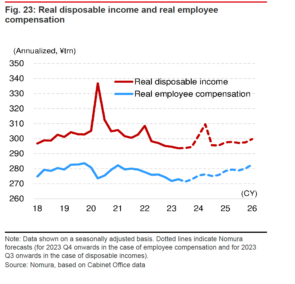 我们预计未来私营部门的国内需求将会回升。在消费支出方面,我们预计从2024年起,在工资上涨和通胀下降的背景下,实际员工薪酬将开始上升,消费将有所恢复。