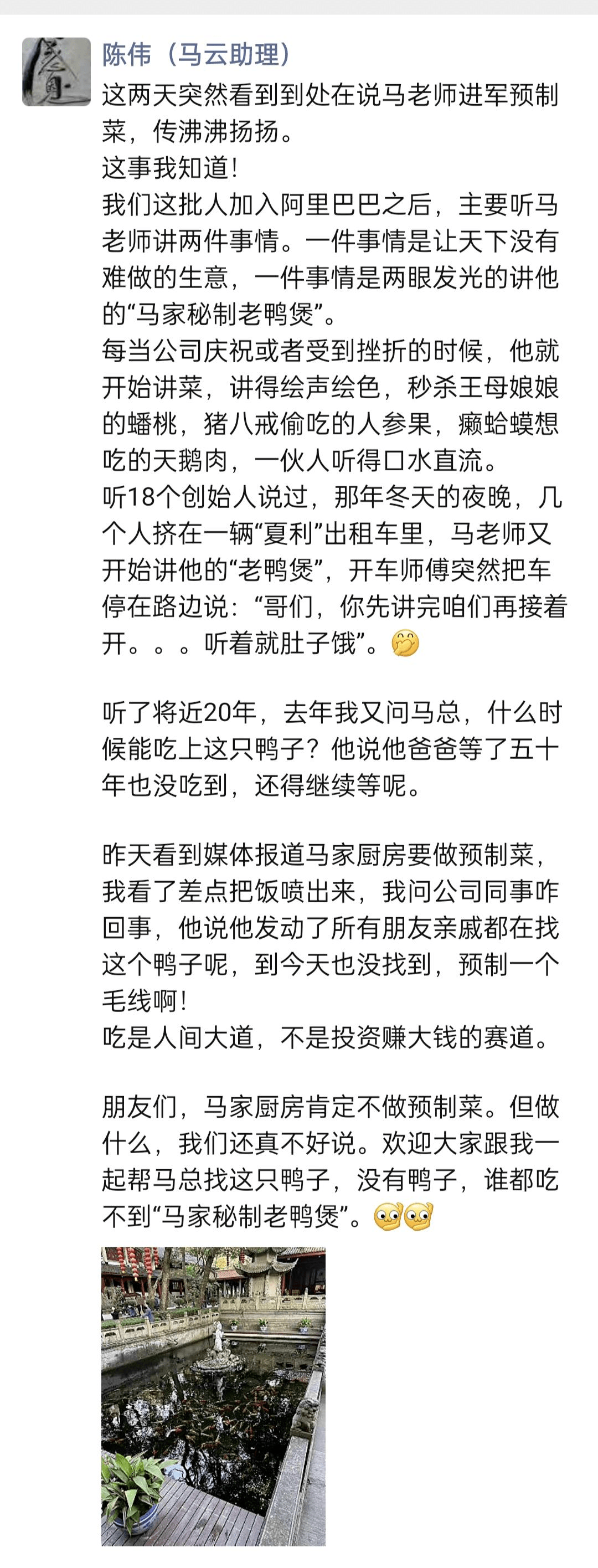 马云前助理陈伟今天在朋友圈称,马家厨房不做预制菜。