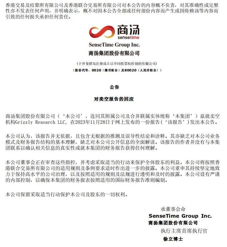 中新经纬11月28日电 商汤28日午间在港交所发布公告,回应卖空机构灰熊(Grizzly Research LLC)的做空报告。