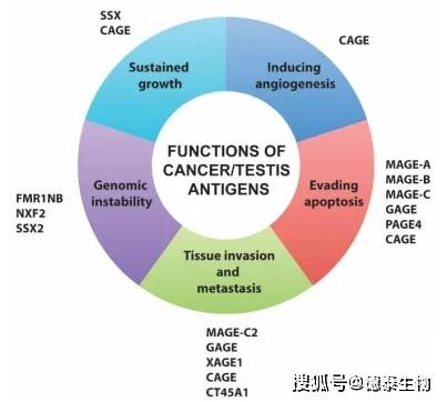 (3)癌症种系抗原(CGAs):在免疫优势种系组织(缺乏抗原递呈机制)中表达,而在体细胞组织中表观基因沉默;在肿瘤中异常表达促进肿瘤发生,从而大大降低靶向肿瘤外毒性的风险。图3为正在研究中的CGAs靶点,其中一些已被用于癌症治疗研究。