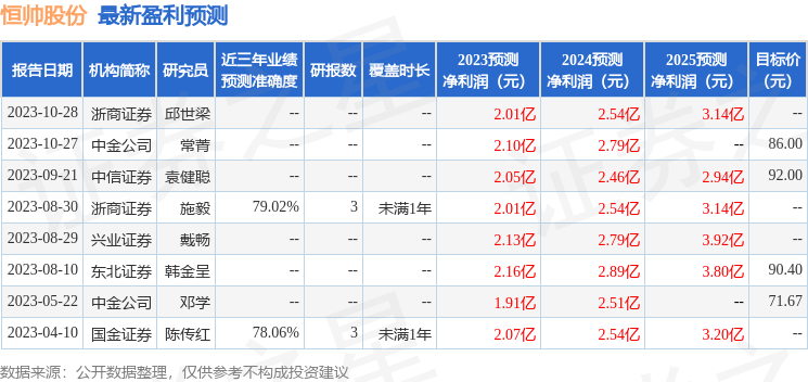 恒帅股份2023年三季报显示,公司主营收入6.62亿元,同比上升26.34%;归母净利润1.5亿元,同比上升39.33%;扣非净利润1.41亿元,同比上升48.48%;其中2023年第三季度,公司单季度主营收入2.64亿元,同比上升30.72%;单季度归母净利润5867.43万元,同比上升43.07%;单季度扣非净利润5679.02万元,同比上升48.09%;负债率20.7%,投资收益737.82万元,财务费用-740.22万元,毛利率36.08%。