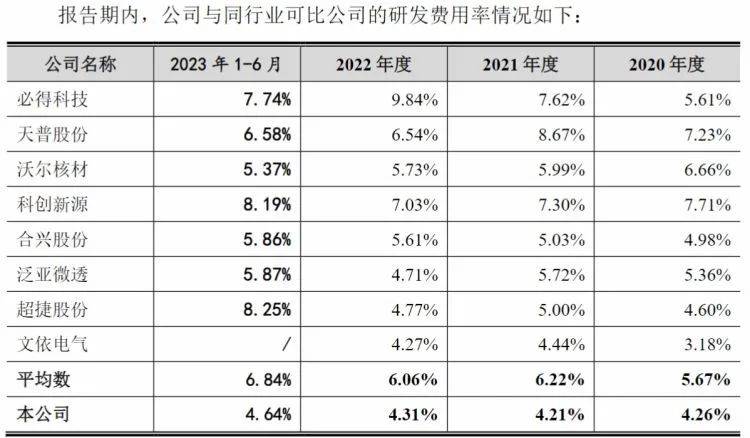 研发方面,虽然总体上报告期内研发投入金额逐年增长,但公司研发费用率低于同行业可比公司平均值,与合兴股份、泛亚微透、超捷股份和文依电气较为接近,主要原因系公司报告期内快速发展,营业收入增长速度快于研发投入增长速度。