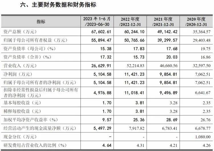 报告期内(2020-2022年、2023年1-6月),公司的营业收入分别为32,597.50万元、46,660.56万元、52,214.83万元和26,629.91万元,近三年营业收入年复合增长率为26.56%,增速较快;同期净利润分别为7062.51万元、9854.81万元、11,421.23万元和5104.58万元,也保持稳定增长。