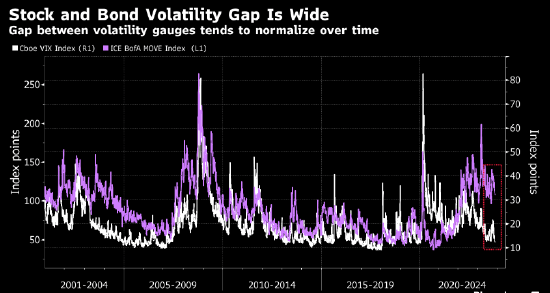 “随着通胀回归正常的速度快于预期且增长仍坚韧,市场进一步拥抱美国‘反向’金发女郎经济,支撑跨资产波动率继续走低,”策略师们表示。
