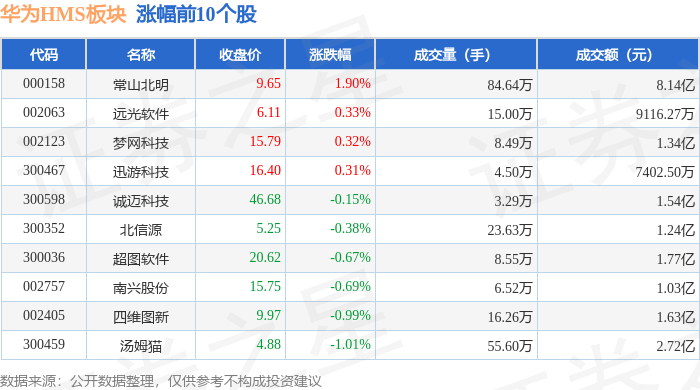 北向资金方面,当日华为HMS板块北向资金持股市值为123.94亿元,增持1.31亿元。其中增持最多的是金山办公,增持了0.61亿元。减持持最多的是科大讯飞,减持了0.15亿元。华为HMS板块北向资金持股变动明细见下表: