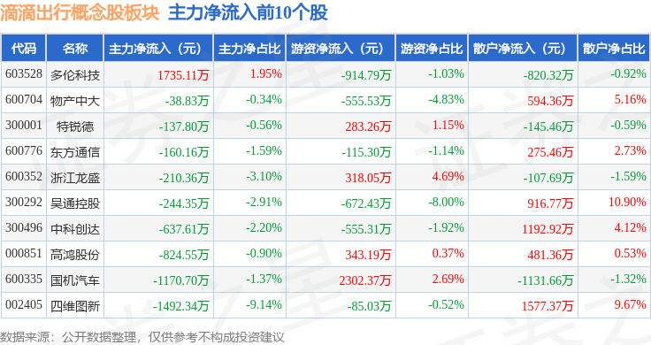 从资金流向上来看,当日滴滴出行概念股板块主力资金净流出4.37亿元,游资资金净流入9606.54万元,散户资金净流入3.41亿元。滴滴出行概念股板块个股资金流向见下表: