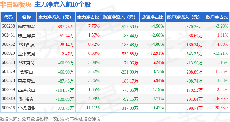 从资金流向上来看,当日非白酒板块主力资金净流出5865.52万元,游资资金净流出192.07万元,散户资金净流入6057.59万元。非白酒板块个股资金流向见下表: