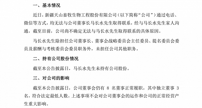 同日晚间,*ST天山发布了一则与美吉姆内容几乎一样的公告,称同样无法与其董事长取得联系。