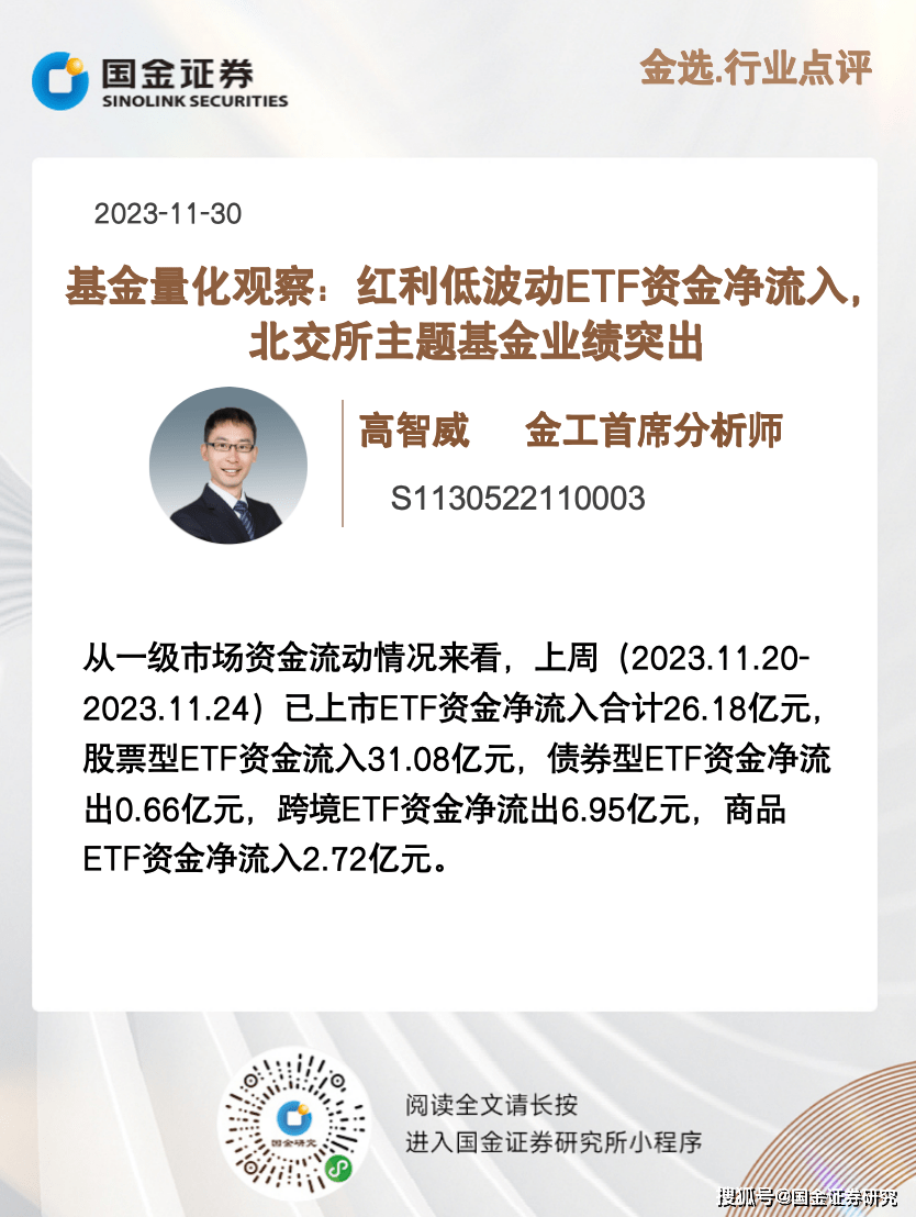 从一级市场资金流动情况来看,上周(2023.11.20-2023.11.24)已上市ETF资金净流入合计26.18亿元,股票型ETF资金流入31.08亿元,债券型ETF资金净流出0.66亿元,跨境ETF资金净流出6.95亿元,商品ETF资金净流入2.72亿元。