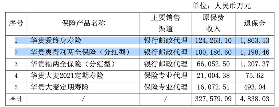 拆分产品线来看,2022年华贵人寿旗下保费收入前五的产品分别为三款寿险和两款分红险,其中“华贵爱终身寿险”和“华贵爽得利两全保险(分红型)”分别实现保费收入12.43亿元、10.02亿元;分别占总保费收入的31.7%和25.55%,这也与华贵人寿保费收入构成相一致。