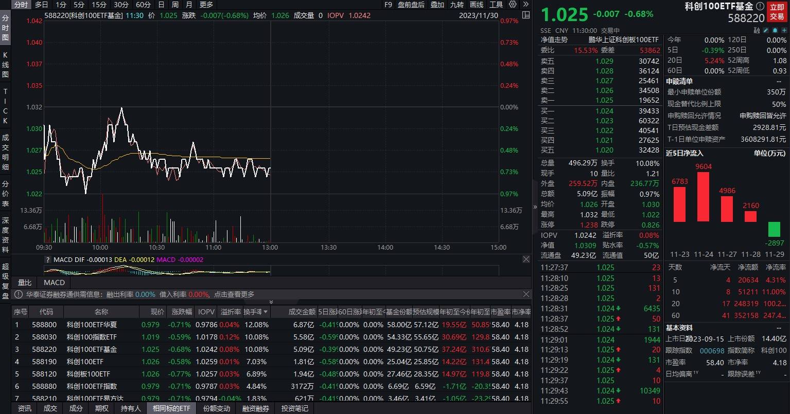 截至2023年11月30日11:30,科创100ETF基金(588220)微跌0.68%,成交额5.09亿元,委比15.53%,换手率10.08%,市场交投活跃。数据显示,该基金11月29日资金净流出2897万元,近20日有17日均获资金净流入,合计“吸金”达24.83亿元,净流率100.20%。