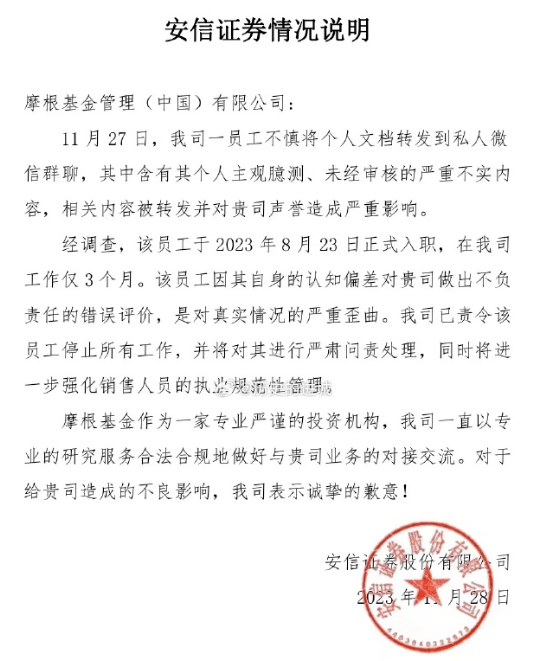 在网传截图中,安信证券表示,“11月27日,公司一员工不慎将个人文档转发到私人微信群聊,其中含有其个人主观臆测、未经审核的严重不实内容,相关内容被转发并对摩根基金声誉造成严重影响。经调查,该员工于2023年8月23 日正式入职,在安信证券工作仅 3个月。该员工因其自身的认知偏差对摩根基金做出不负责任的错误评价,是对真实情况的严重歪曲。安信证券已责令该员工停止所有工作,并将对其进行严肃问责处理。对于给摩根基金造成的不良影响,安信证券表示诚挚的歉意!”