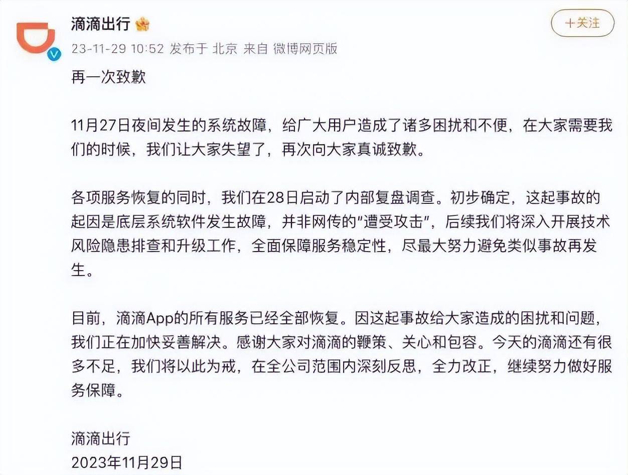 11月29日,滴滴出行再次就11月27日晚间的故障发文致歉,并给出技术方面的初步排查结果。滴滴表示,初步确定,这起事故的起因是底层系统软件发生故障,并非网传的“遭受攻击”,后续公司将深入开展技术风险隐患排查和升级工作,全面保障服务稳定性,尽最大努力避免类似事故再发生。