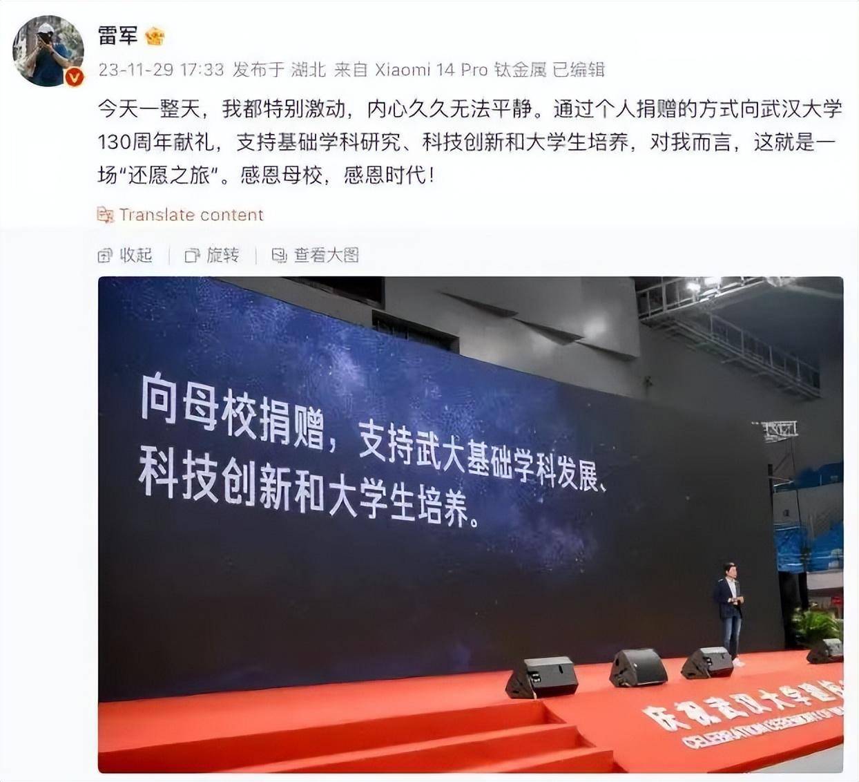 据武汉大学官网消息,11月29日上午,武汉大学1987级计算机系校友,小米集团创始人、董事长兼首席执行官雷军向母校捐赠13亿元人民币。据了解,该笔捐赠刷新了武汉大学建校以来单笔最大捐赠额,也是全国高校收到的最大一笔校友个人现金捐赠。
