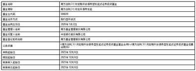 注: 1、本基金为定期开放基金,本次开放期时间为2023年12月8日至2023年12月11日。其中:2023年12月8日的交易时间,本基金接受投资人的赎回和转换转出申请;2023年12月8日(含该日)至2023年12月11日(含该日)期间的工作日的交易时间,本基金接受投资人的申购和转换转入申请。