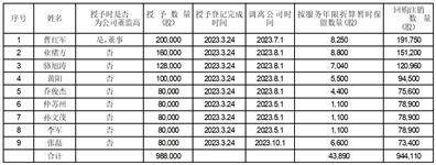 根据《2022年限制性股票激励计划》,首次授予的9名激励对象因工作调动不再在公司(含控股子公司)任职,公司按照实际服务年限折算(暂时保留待解除限售的限制性股票数量=激励对象获授的限制性股票数量×33%×激励对象自限制性股票完成登记之日起至激励对象在公司服务的最后一个月的月份数÷24)暂时保留其已获授的限制性股票数量43,890股限制性股票,后续按照相应批次的解除限售安排解除限售,其余尚未解除限售的限制性股票944,110股,由公司按调整后的回购价格加上同期银行存款利息进行回购注销。具体如下: