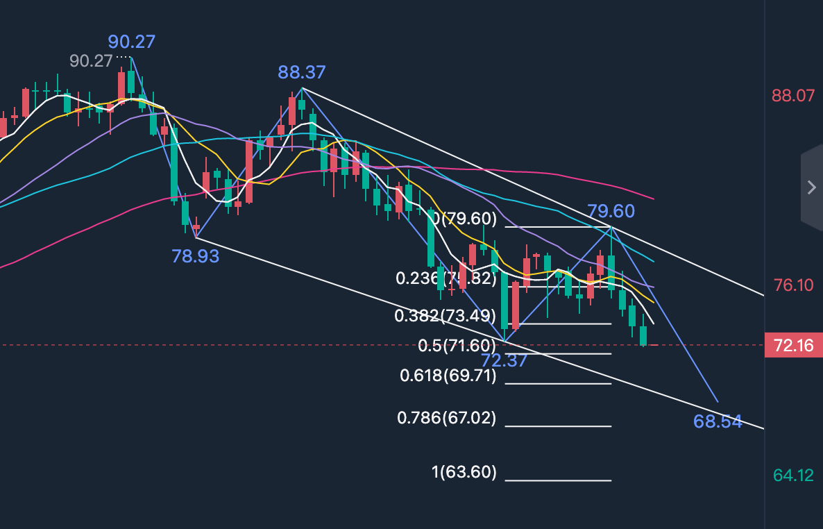 原油向下跌破前低位置,按照前面的思路来看,大概率延续走5浪下跌,按照结构力度,下方先关注71.6附近支撑,其次关注69.7附近支撑。