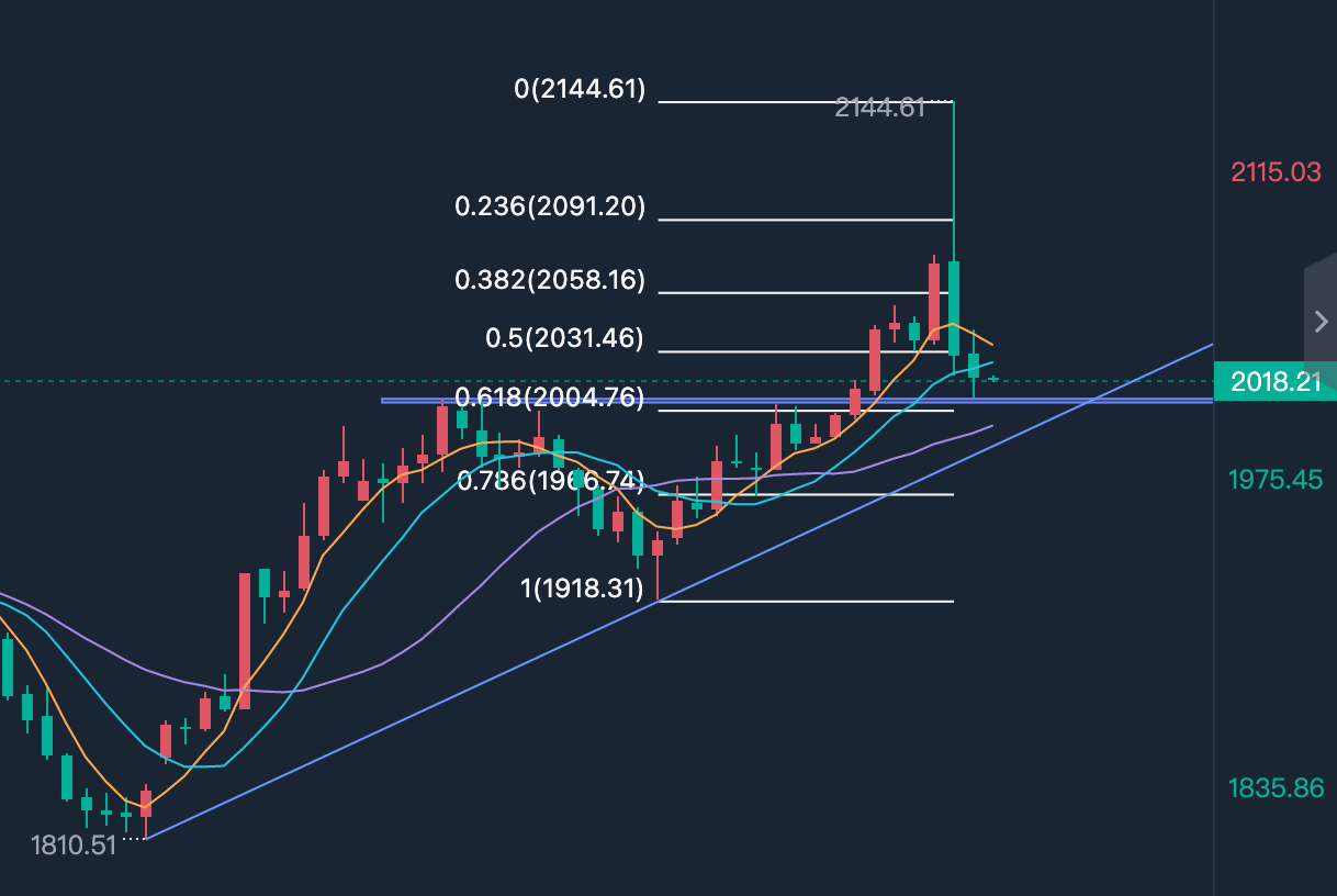 综合来看,黄金今日下方依次关注2010/2009、2005/2004、1998/1997、1990/1989附近支撑;上方依次关注2027、2035/2036附近阻力。