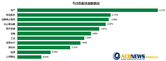对利率敏感的房地产、银行和科技板块今日表现良好。房地产板块上涨3.1%,其中Mirvac劲升4.5%至2.10澳元,Dexus攀升3%至7.23澳元,Goodman的涨幅为1.8%,终盘以23.48澳元报收。