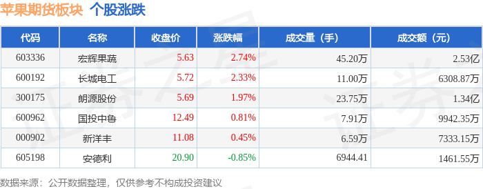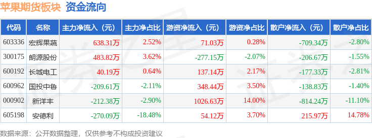 北向资金方面,当日苹果期货板块北向资金持股市值为1.53亿元,增持0.13亿元。其中增持最多的是新洋丰,增持了0.12亿元。苹果期货板块北向资金持股变动明细见下表: