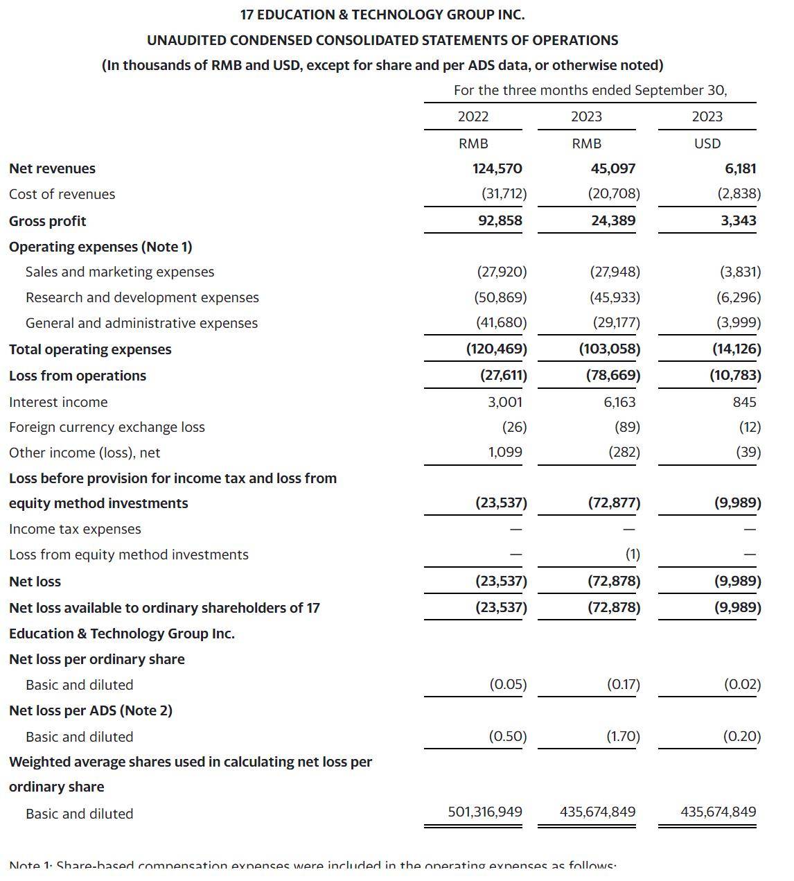 一起教育科技2023年第三季度运营亏损为7870万元,上年同期的运营亏损为2761万元。