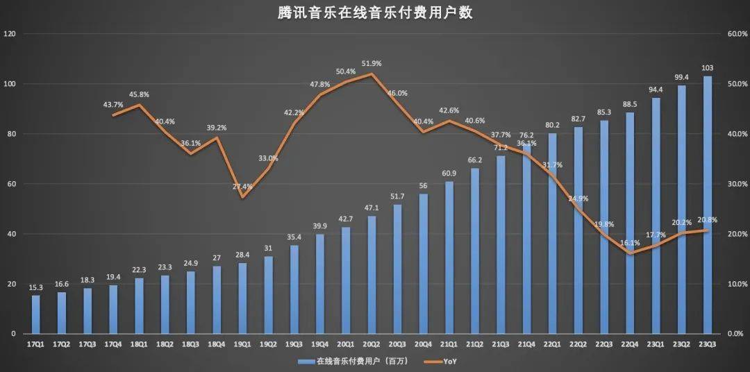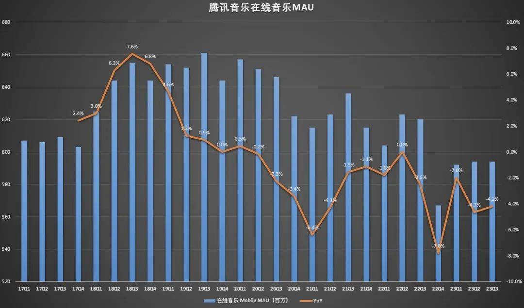 数据显示,2023年Q3,腾讯音乐在线音乐移动月活用户为5.94亿,同比减少4.2%,已连续14个季度同比下滑。